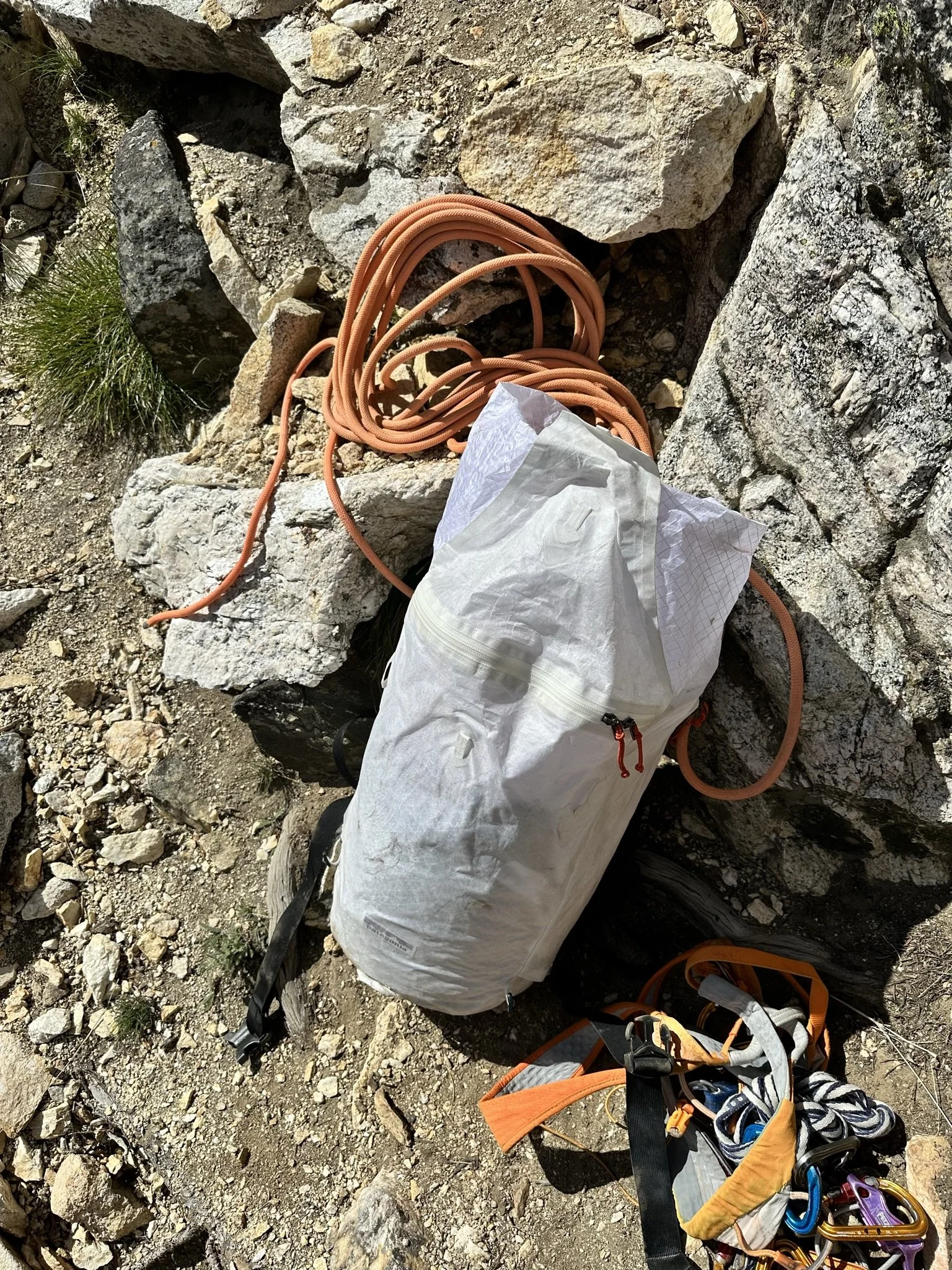 This custom Aluula pack was designed for Zahan Billmoria, a Patagonia athlete. It was created as a custom request and served as a testbed for a new material. The 28-liter pack, weighing just 98 grams per square meter, offers exceptional lightness and durability, thanks to Aluula V98 Graphlite, a revolutionary material produced through a patented fusion process that combines polymer films. This innovation enhances performance across various terrains. The pack features fully taped seams, self-bonded lash points, a tool sheath with a magnetic Fidlock closure, and dedicated storage pockets for ropes and snow safety tools.